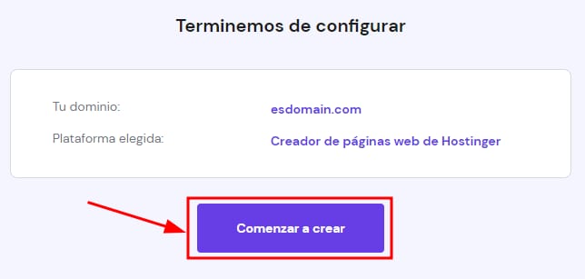 Después de este paso, continúa asignando un nombre de dominio para tu sitio web. Una vez hecho esto, debes confirmar tu elección. Si necesitas realizar cambios en este punto, puedes hacerlo pasando el cursor sobre el nombre de dominio o la plataforma. Cuando todo esté listo, haz clic en Comenzar a crear: