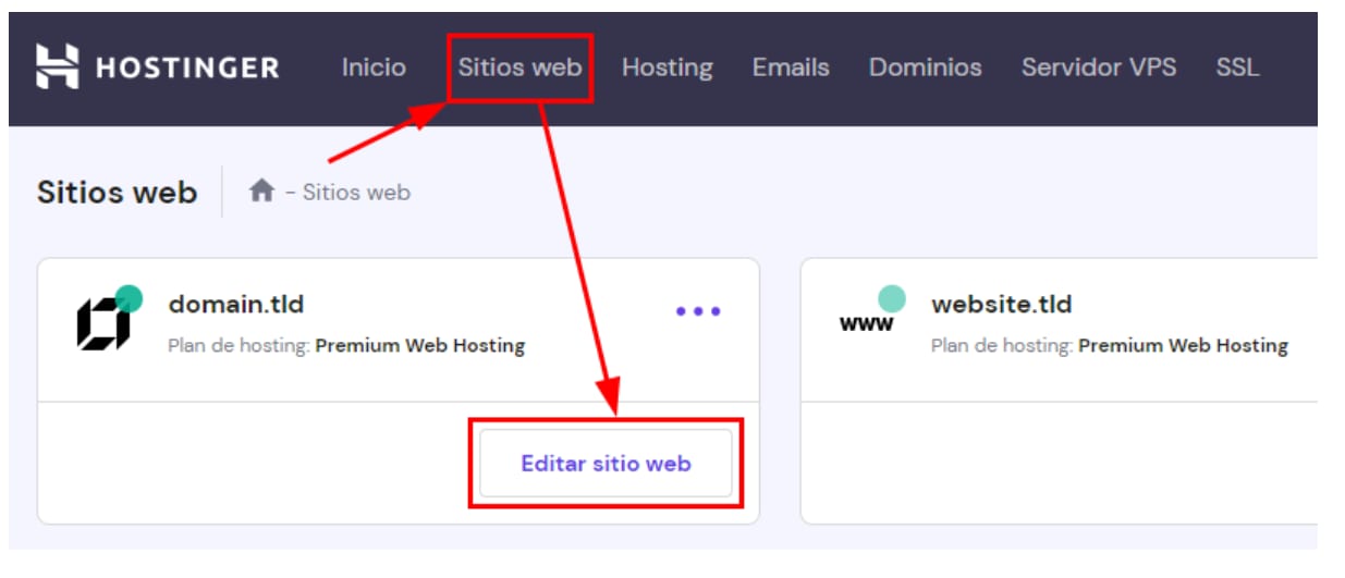 Y para acceder al Creador de sitios web en cualquier momento desde el hPanel, ve a Sitios web → Editar sitio web: