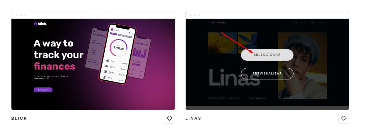 Después de unos minutos, se te presentará la opción de elegir una plantilla para tu sitio web. Explora la galería completa para encontrar la plantilla que mejor se adapte a tu proyecto: hay una opción de vista previa disponible antes de seleccionarla. Para usar una plantilla, haz clic en Seleccionar: