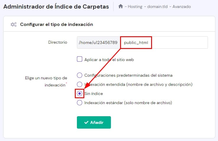 Deshabilita la lista de directorios desde su panel de control: Navega a la página Administrador de Índice de Carpetas. En el campo de directorio, ingresa la carpeta public_html. En el tipo de tipo de indexación, elige Sin índice y da clic en Añadir: