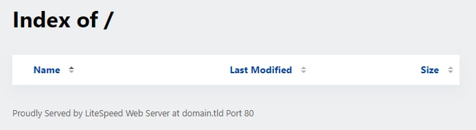 Si no se puede localizar un archivo index.php o index.html en la carpeta raíz (/public_html), aparecerá una página “Index of /”, similar a esta: