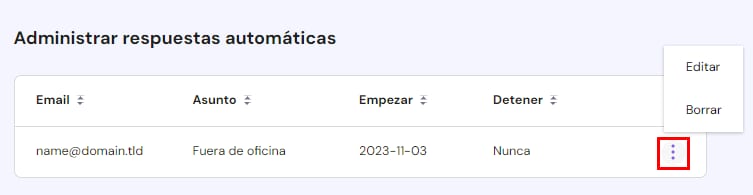 En la sección Respuesta automática, ve a Administrar respuestas automáticas y da clic en el botón de opciones ( ⋮ ):