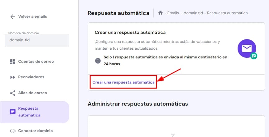 Para crear una respuesta automática, navega a la sección Emails de tu Área de Miembros de Hostinger y da clic en Administrar junto al dominio o subdominio. A continuación, selecciona Respuesta automática en la barra lateral izquierda y da clic en Crear una respuesta automática: