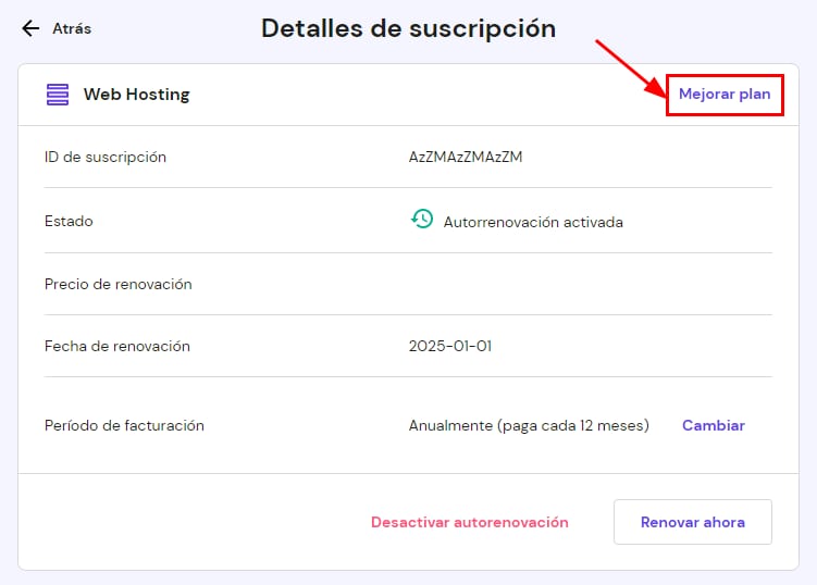 Si estás utilizando el Creador de sitios web para todos tus sitios web, ve a la sección Facturación → Suscripciones de tu panel y da clic en la flecha ❯ junto al servicio para abrir los detalles de la suscripción. Encontrarás la opción para actualizar allí: