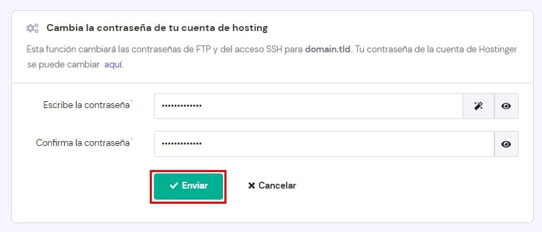Cambiar la contraseña de tu plan de hosting también cambiará la contraseña de tu cuenta FTP. Si deseas cambiar la contraseña de dominios adicionales o cuentas FTP adicionales, puedes hacerlo desde la página Cuentas FTP.