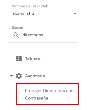 Puedes acceder a esta función navegando a Sitios web → Administrar, buscando Proteger directorios con contraseña en la barra lateral izquierda y dando clic: