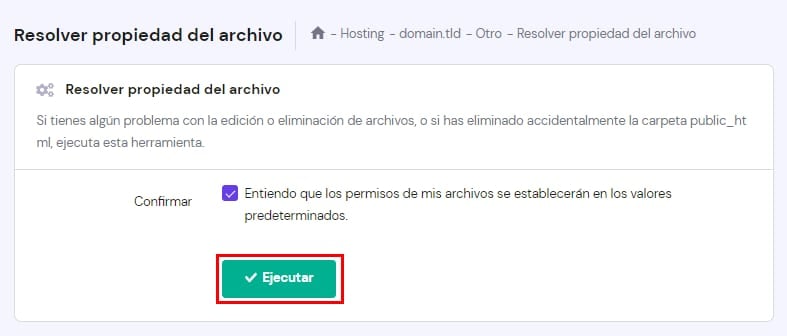 Puedes arreglar fácilmente los permisos de tus archivos abriendo la sección Hosting → Administrar, busca Resolver propiedad del archivo en la barra lateral izquierda y da clic: