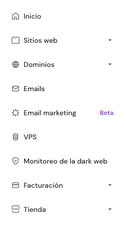 VPS: aquí se encuentran tus planes VPS y tienes la opción de adquirir un nuevo VPS. En el siguiente artículo, podrás saber más sobre esta sección: Cómo usar el panel VPS.