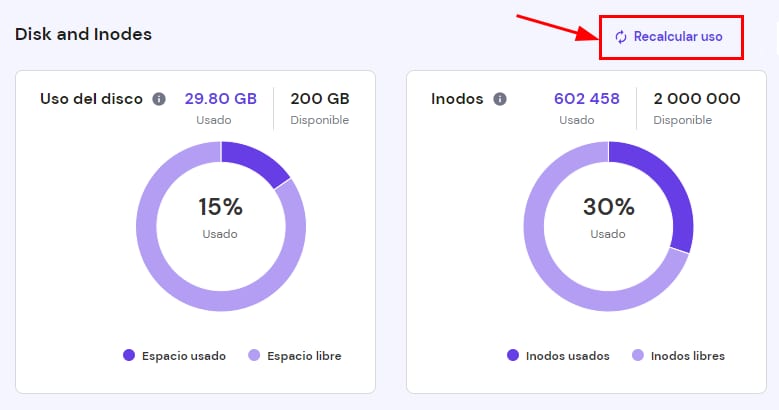 Si el recuento de inodos permanece sin cambios después de eliminar archivos da clic en Recalcular uso: