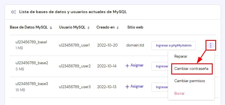 Delante de la base de datos en cuestión, haz clic en ⋮ y selecciona Cambiar contraseña: