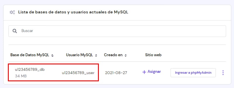 Una vez ahí, recorre hacia abajo. Los detalles se mostrarán justo debajo de Base de datos MySQL y Usuario de MySQL. Debajo del nombre de la base de datos, también encontrarás su tamaño: