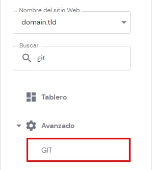 Ve a Sitios web → Administrar. En la barra lateral izquierda, busca GIT y haz clic en él: