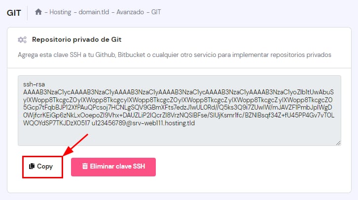 Una vez generada, cópiala para agregarlo a su cuenta de GitHub o Bitbucket en el siguiente paso: