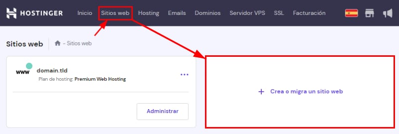 Para comenzar, ve a Sitios web y haz clic en Crea o migra un sitio web: