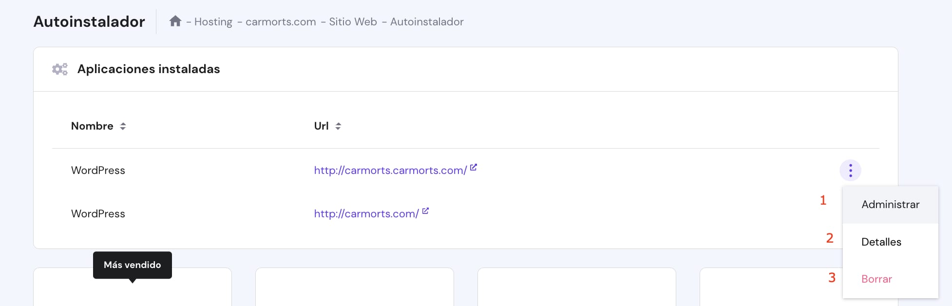 2. Ver los detalles de tu sitio web: URL, nombre de la base de datos, nombre de usuario del administrador y correo.