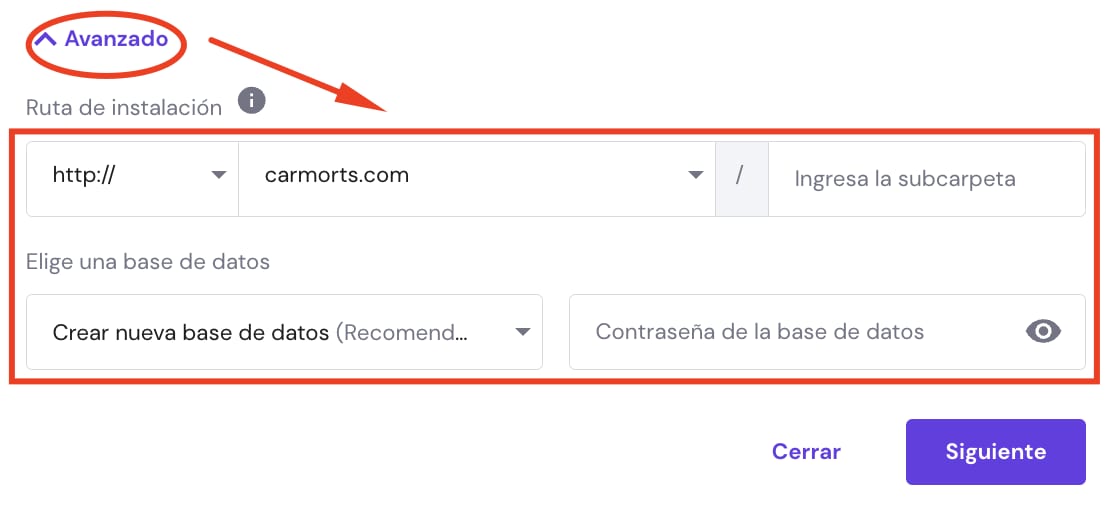 En caso de que quieras especificar un subdirectorio personalizado o usar una base de datos existente, elige Avanzado y completa los detalles: