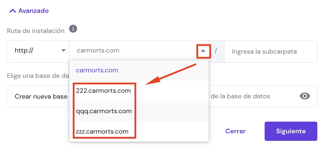 Allí también puedes optar por instalar WordPress en un subdominio: