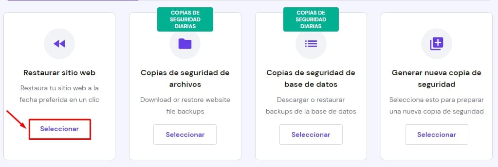 En las opciones de Copias de seguridad de tu panel, selecciona Restaurar sitio web: