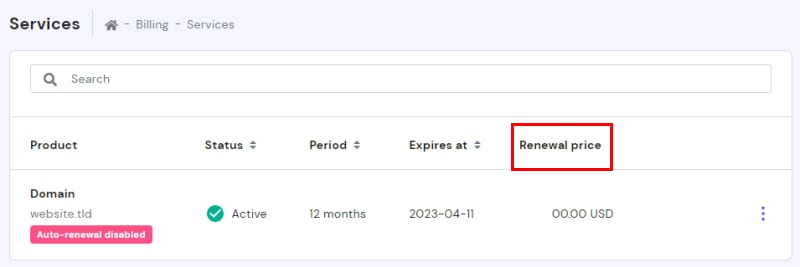Para ver el precio de renovación de tu dominio en cualquier momento, ve a Facturación → Suscripciones. Encontrarás una columna con el Precio de renovación de todos tus servicios comprados: