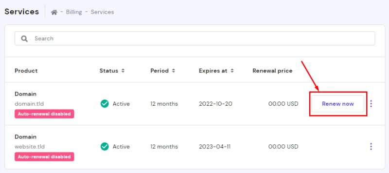 Si compraste un dominio en Hostinger, puedes renovarlo fácilmente en la página Facturación.