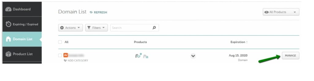 Si tu dominio está registrado con Namecheap, puedes acceder a tu Zona DNS navegando a tu lista de Dominios y haciendo clic en el botón Administrar: