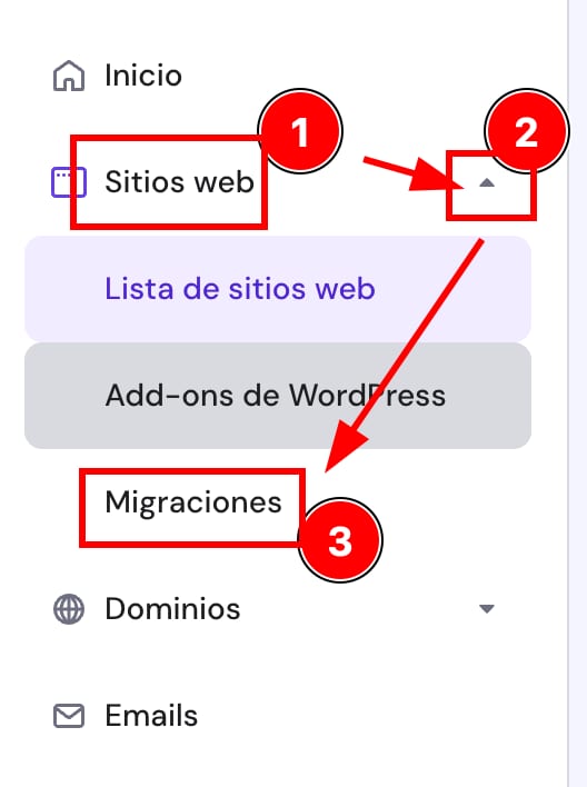 Haz clic en Inicio → haz clic en el menú desplegable en la sección Sitios web y haz clic en Migraciones: