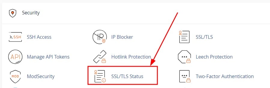 Si necesitas realizar una instalación manual, navega hasta la sección Seguridad y haz clic en Estado SSL/TLS (SSL/TLS Status):