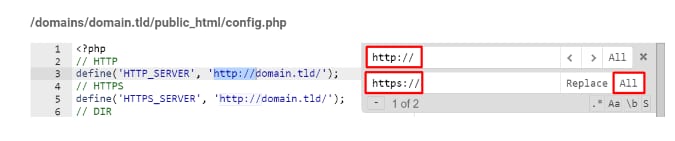 Primero, asegúrate de que ambos archivos config.php (uno en tu directorio raíz public_html y otro en el directorio /admin/config.php) tengan URL HTTPS que conduzcan a tu dominio. En el administrador de archivos, puedes realizar fácilmente el reemplazo necesario: presiona Ctrl + H , inserta http:// en el primer campo y https:// en el segundo. Después de esto, elige reemplazar todo: