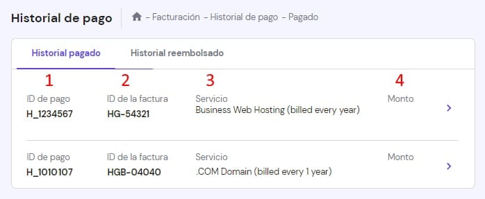 En el historial de pagos, se presentará la lista de todos tus pagos anteriores. También podrás consultar tus facturas reembolsadas haciendo clic en la pestaña Historial de reembolsos.