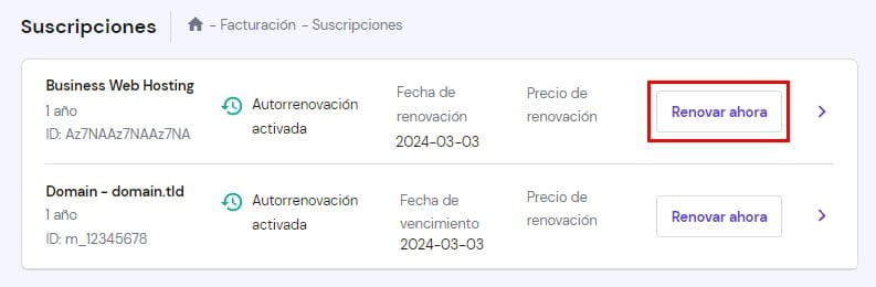 La sección Suscripciones contiene una lista de todos los servicios activos en tu cuenta, el estado de renovación automática y fechas de vencimiento. También puedes renovar tu dominio o hosting haciendo clic en el botón Renovar ahora: