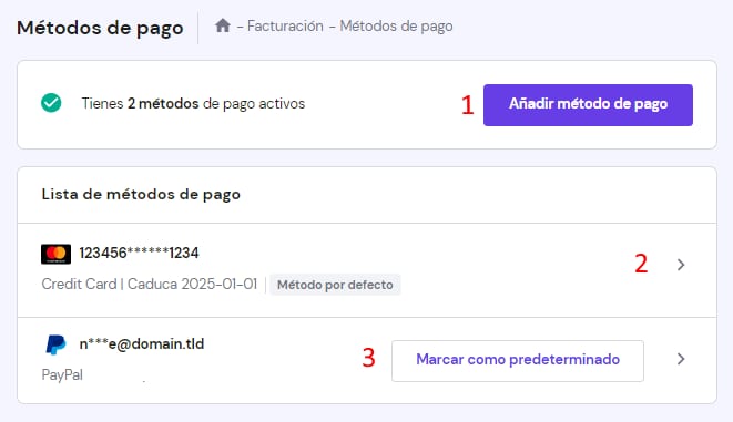 En el área Métodos de pago, puedes administrar tus métodos de pago. Puedes usar los métodos de pago guardados para comprar cualquiera de nuestros servicios con solo un clic. Además, puedes habilitar la renovación automática de tus servicios si tienes un método de pago activo agregado: