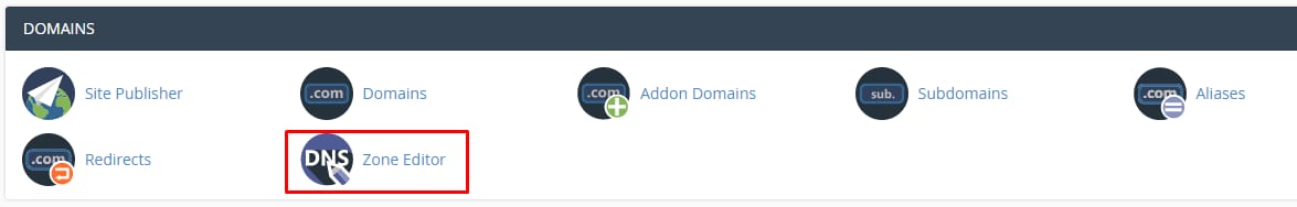 Tus registros TXT se pueden administrar fácilmente con la ayuda de la sección Editor de zona, que puedes encontrar en tu panel de control. Abre tu cPanel y busca Dominios → Editor de zona: