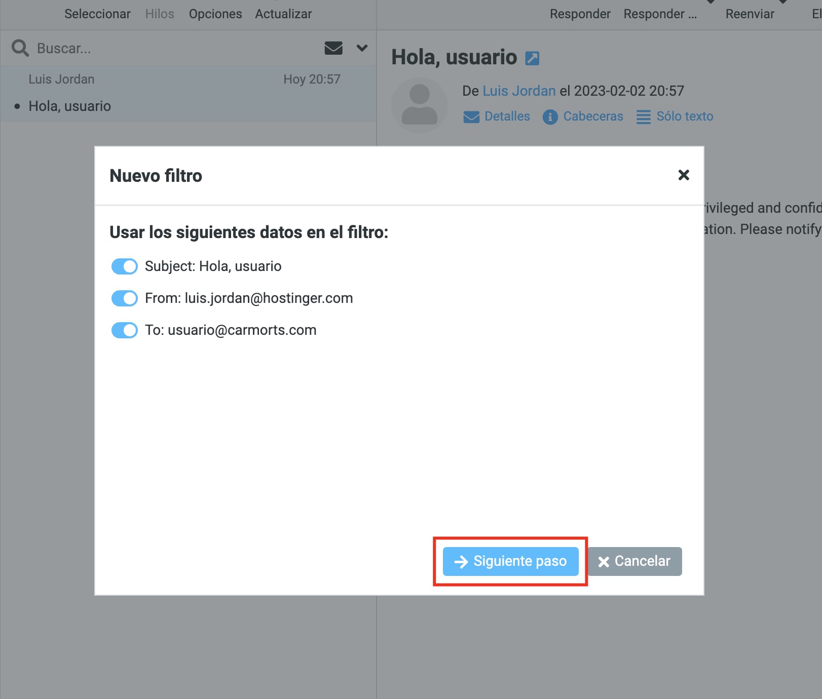 Especifica la configuración del filtro, como asunto, destinatario y/o remitente, y haz clic en Siguiente paso: