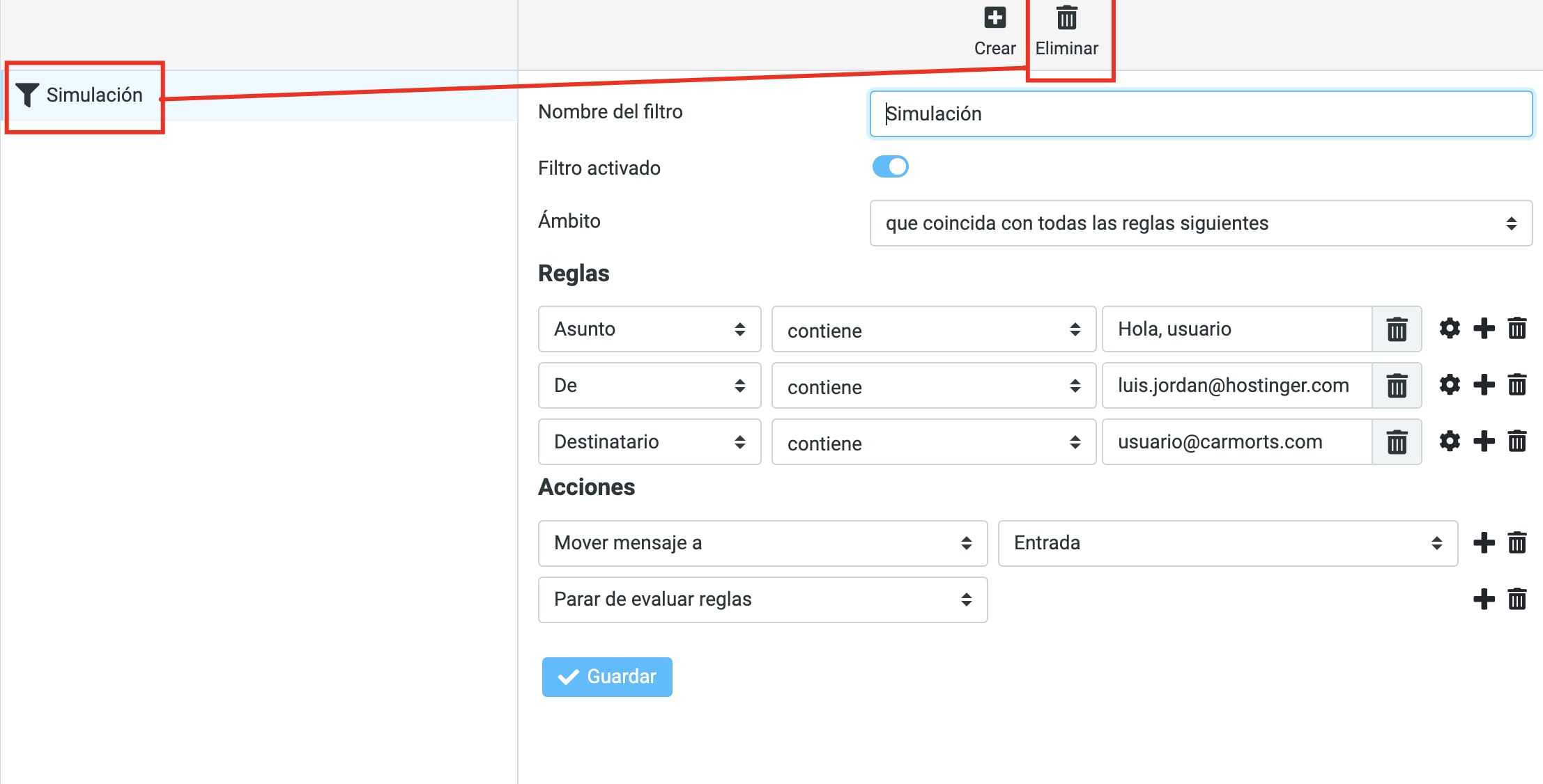 Acciones (Actions): qué pasará con los mensajes que cumplan con las reglas del filtro