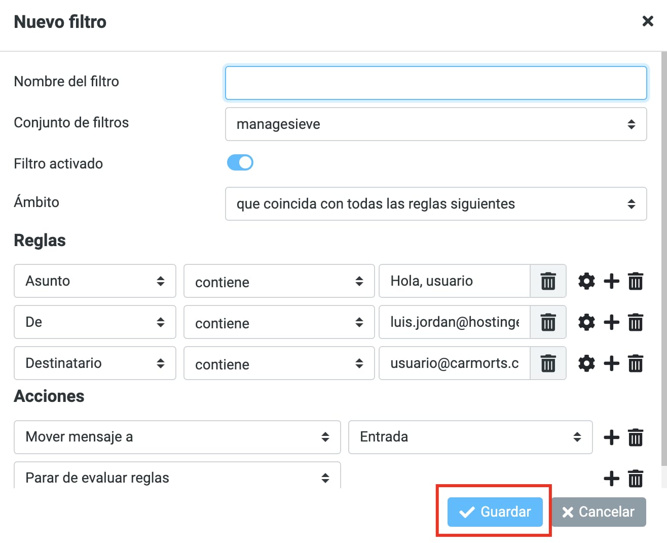 Reglas (Rules): condiciones que activarán el filtro.