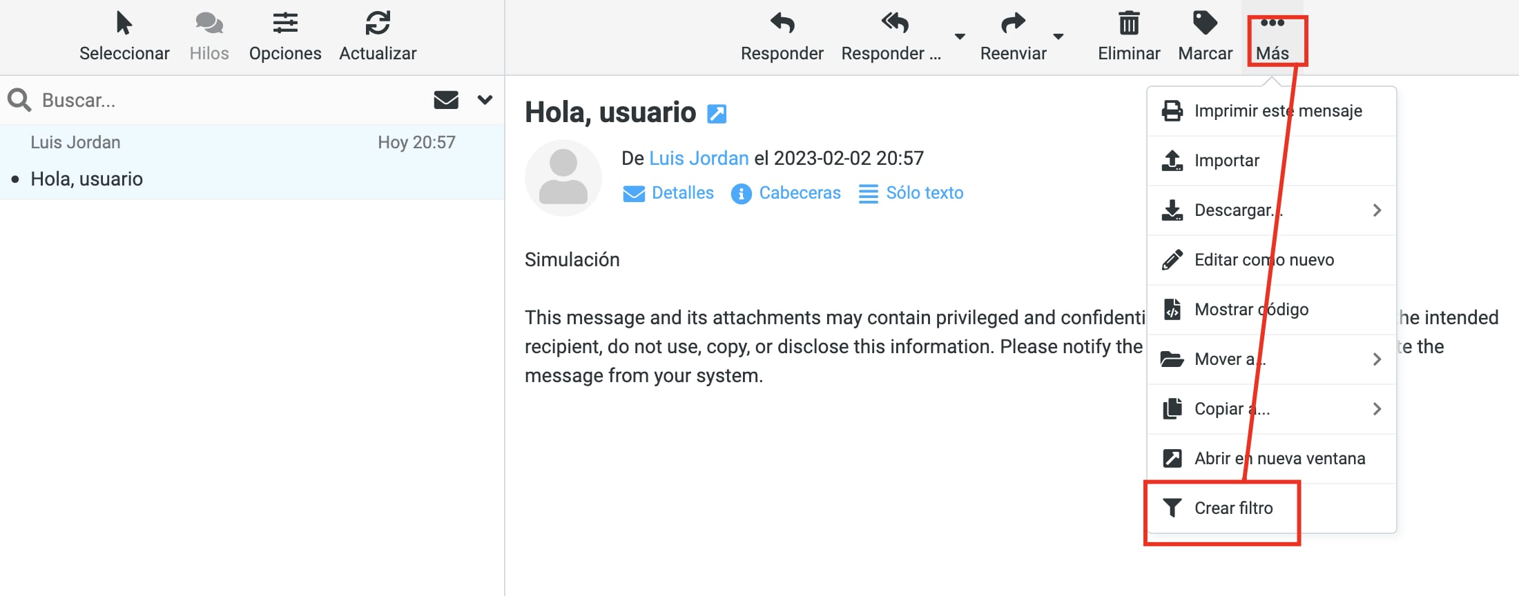 Puedes crear un filtro de email por medio de Webmail. Solo accede a tu cuenta de Webmail, luego abre uno de tus emails (que es el que quieres filtrar) y selecciona Más → Crear filtro: