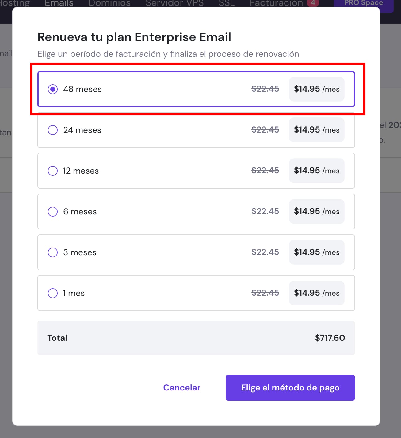 Se te presentará una ventana emergente, donde podrás renovar tu Starter o Premiun por hasta cuatro años con solo unos pocos clics: