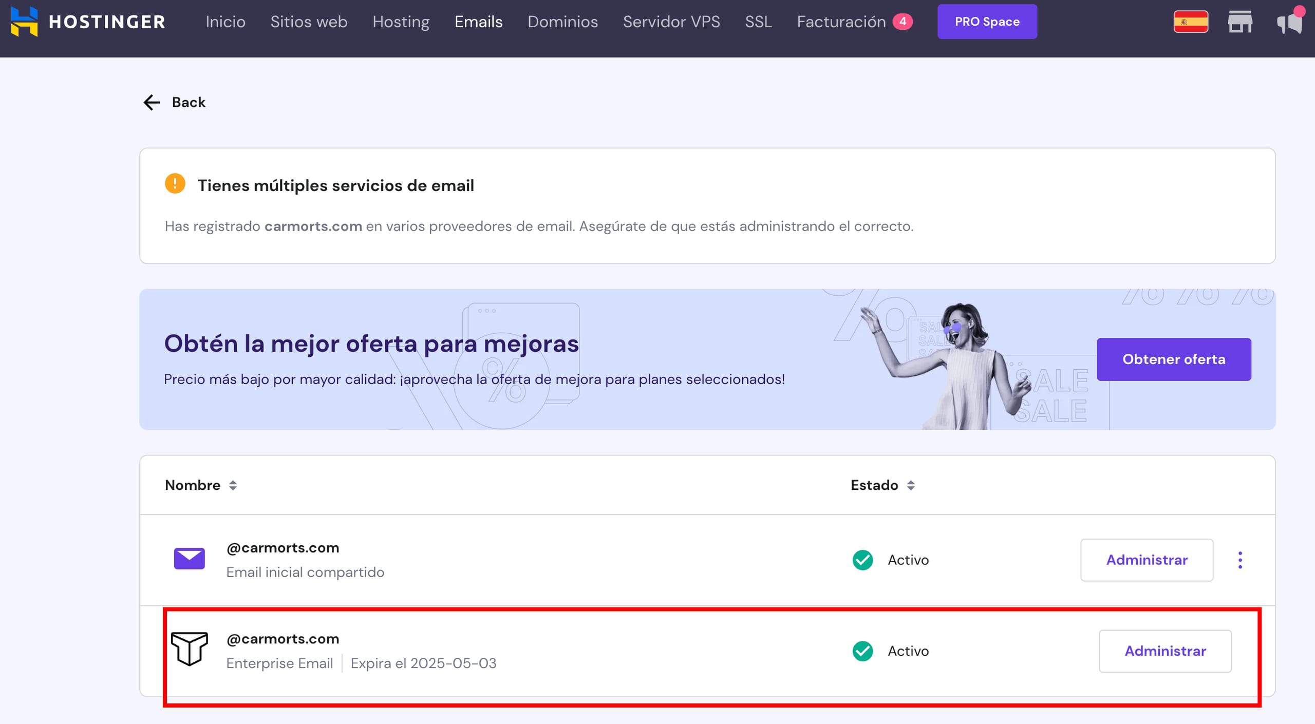 Si el plan de email ha pasado la fecha de vencimiento, puedes adquirir un nuevo pedido.