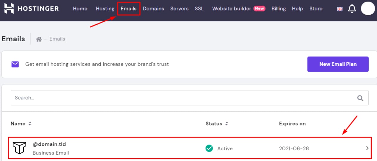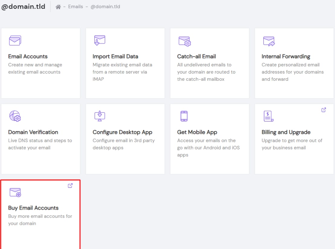 Puedes comprar fácilmente buzones de correo adicionales para Titan Email abriendo la sección de Emails y seleccionando tu dominio: