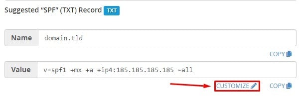 Si deseas establecer un registro SPF predeterminado, desplázate hacia abajo hasta Registro SPF sugerido y haz clic en el botón Personalizar: