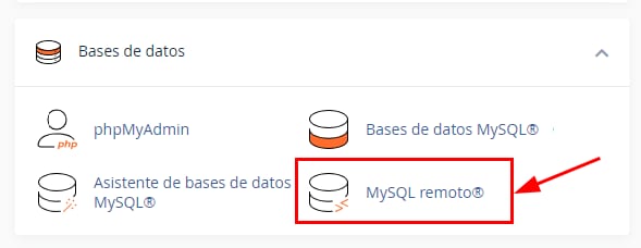 Para permitir la conexión, abre tu cuenta cPanel y dirígete al menú MySQL® remoto de la sección Bases de Datos: