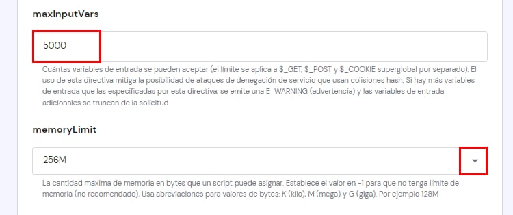 Solo puedes establecer valores que sean iguales o inferiores al límite de tu plan de hosting. Si estableces un parámetro superior, se aplicará el valor máximo de tu plan de alojamiento