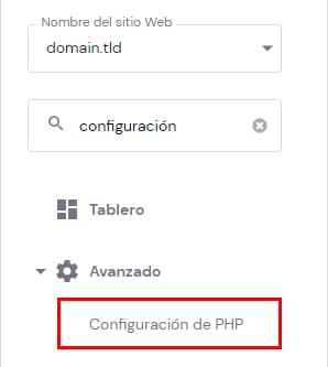Desde el hPanel, puedes cambiar los valores de muchos parámetros de PHP. Para eso, solo tienes que ir a Sitios web → Administrar, busca Configuración de PHP en la barra lateral y haz clic: