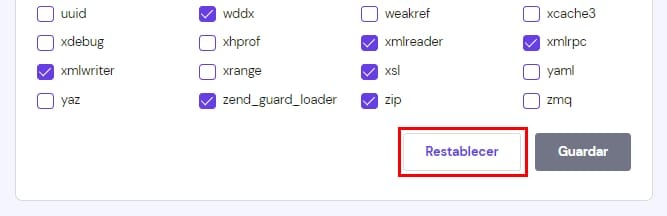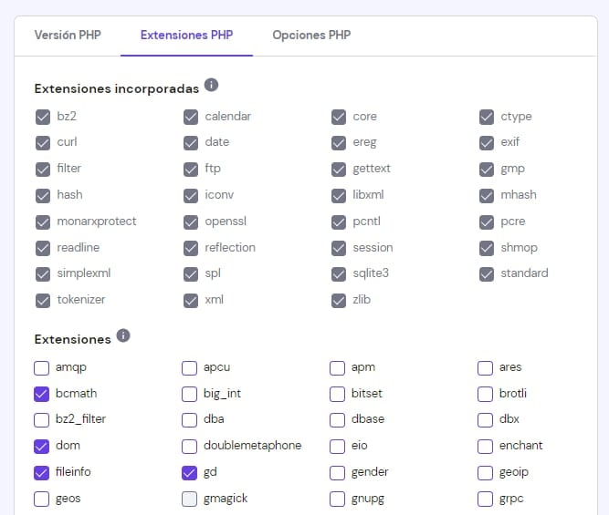 La lista de extensiones disponibles puede variar según la versión de PHP elegida