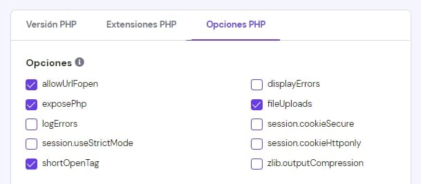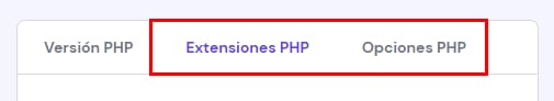 En la página a continuación, selecciona la pestaña correspondiente para administrar las extensiones de PHP u opciones de PHP: