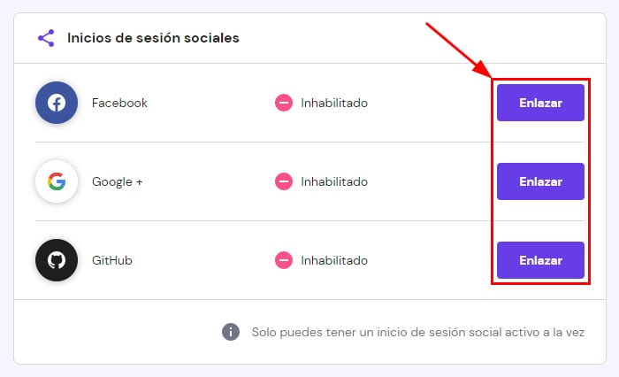En la página Información de la cuenta, encontrará la sección Inicios de sesión sociales . Allí verá las opciones de inicio de sesión social disponibles. Para habilitarlo, da clic en el botón Enlazar junto a tu opción preferida. Solo puedes elegir una opción a la vez: