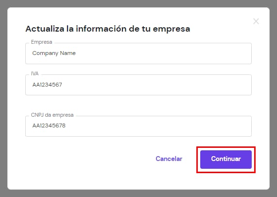 Introduce el nombre de tu empresa, el código de IVA y el código de la empresa. Si no tienes un código de empresa por separado, ingresa el código de IVA una vez más. Cuando todo esté listo, da clic en Continuar para guardar los cambios: