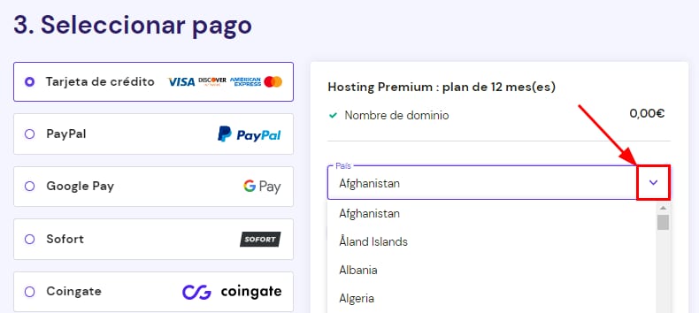 Una vez que hayas elegido un período y creado tu cuenta, encontrarás la opción para seleccionar un método de pago. Antes de pagar, selecciona tu país de la lista desplegable: