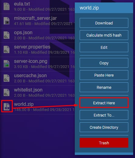 Una vez hecho esto, arrastra tu archivo Mundo comprimido/archivado desde tu escritorio a la ventana Administrador de archivos (File Manager):