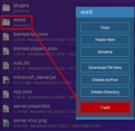 Una vez allí, elimina la carpeta Mundo (World) actual haciendo clic derecho y luego Papelera (Trash) (asegúrate de que tu servidor esté detenido antes de hacer esto):